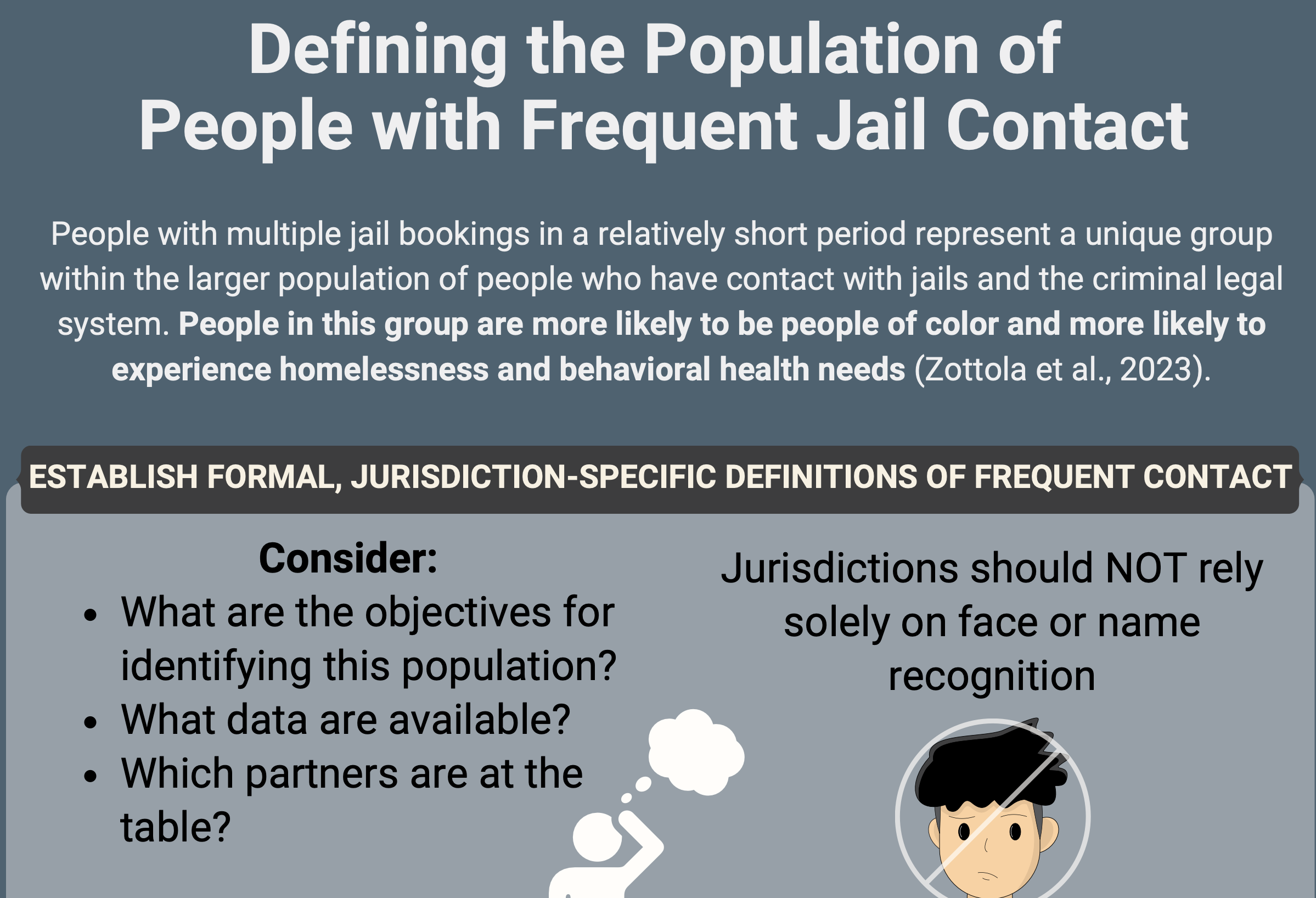 Jurisdictions should develop formal definitions or criteria to support the consistent operationalization and identification of people with frequent jail contact. These definitions should drive the development and implementation of related policies.